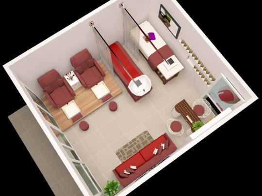 Mặt bằng cửa chính là chính Tây nên hướng nắng vào buổi chiều cộng với sở thích của Chủ đầu tư là gam màu đỏ đậm vì vậy chúng tôi đã kết hợp với tông màu trắng và đỏ đậm khiến không gian Salon vào buổi sáng cũng không quá tối và buổi chiều cũng không quá nóng và rực màu khi có nguồn sáng tự nhiên chiếu vào .
